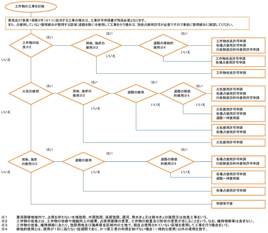 施設用地使用・海岸保全区域内占用工作物改良手続のフローチャート(火気使用及び道路使用を含む)