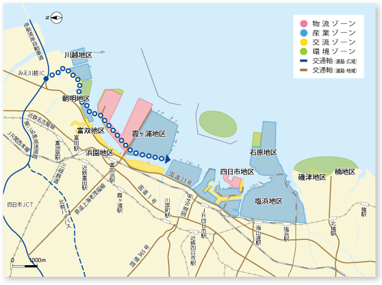 「物流ゾーン」や「産業ゾーン」は、霞ヶ浦地区、四日市地区及び既存のコンビナート企業用地等を中心とする海側の空間となります。この空間は、主として物流機能や産業機能の拡充をめざし取組を進める空間ですが、四日市地区では重要文化財や千歳運河沿いの景観を活用した産業と密接に関係する交流機能を展開するなど、この中においても交通アクセスに留意しつつ、必要な限りの交流機能や環境機能の拡充をめざした取組を進めたいと考えています。