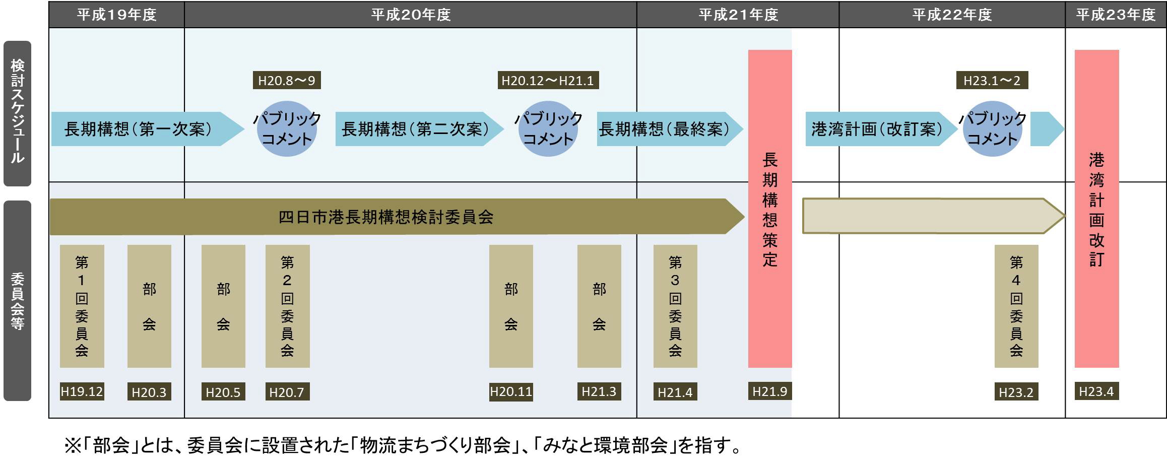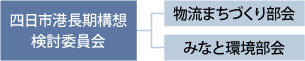四日市港管理組合では、平成20年代前半を目標年次とした「四日市港港湾計画(平成10年改訂)」を見直すために、学識経験者、港湾利用者等で組織する「四日市港長期構想検討委員会」を設置し、委員からの意見・提案を受けながら、平成40年代前半を想定した「四日市港長期構想」と平成30年代前半を目標年次とする「四日市港港湾計画」の策定を進めました。その中でも特に「物流・産業」「安心・安全」「都市・住民」について検討する組織として「物流まちづくり部会」、「都市・住民」「環境」について検討する組織として「みなと環境部会」を設置しました。