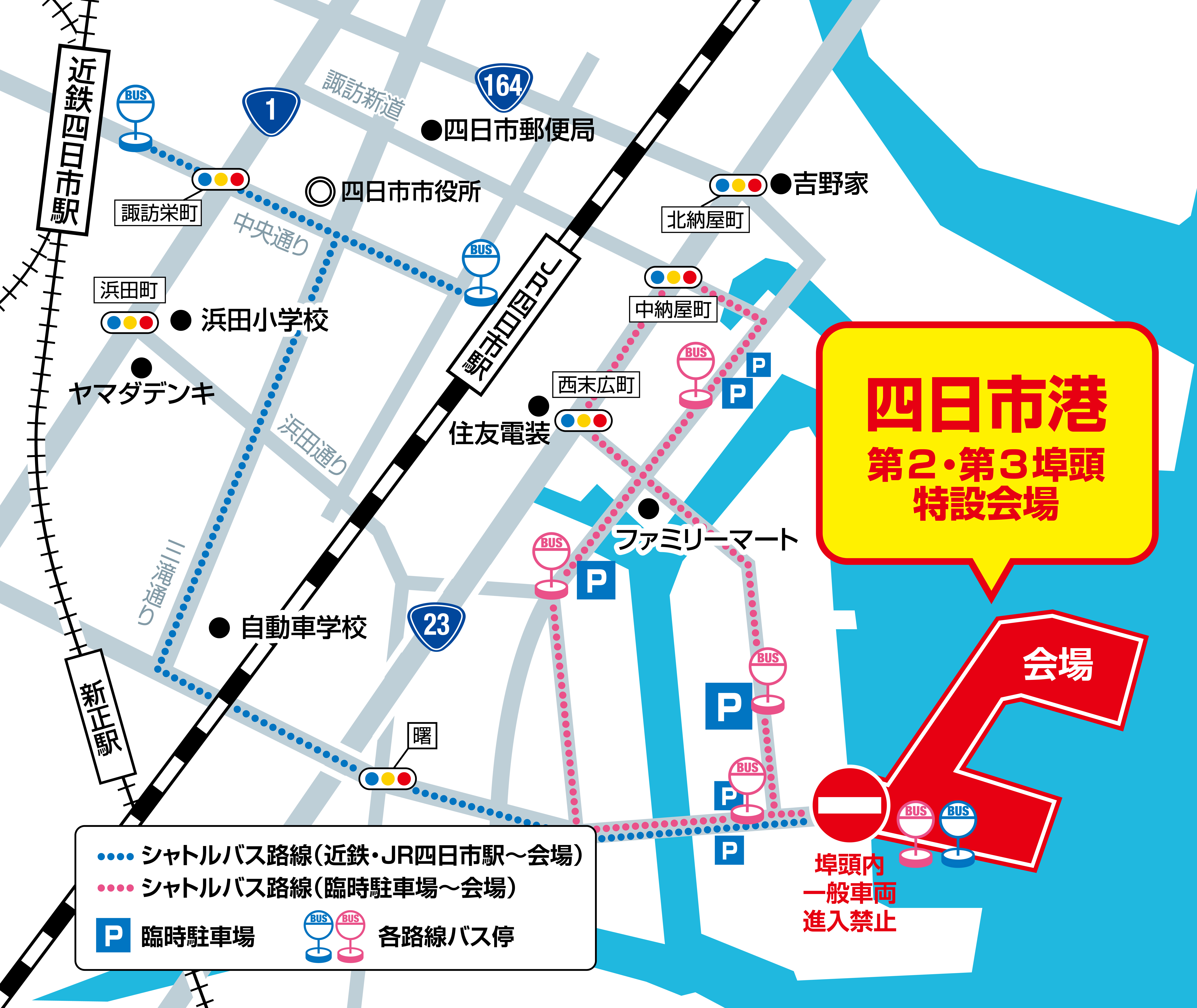 ・会場となる埠頭は、原則一般車両の通行を禁止しております。港まつり会場までは、近鉄四日市駅・JR四日市駅から無料シャトルバスをご利用ください。